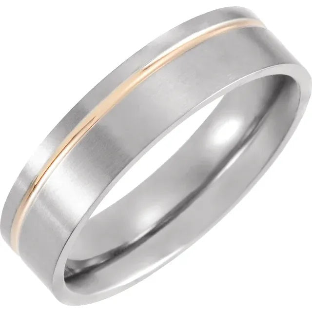 Wear something sleek and dashing. This titanium ring features a grooved band that holds 18 karat rose gold plating. The band is 6 millimeters in width.