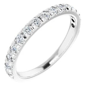 This wedding band would match almost any engagement ring. The round cut diamonds are all prong set for a dainty look. With a total diamond weight of 0.50 carat, the ring catches the light magnificently. This beauty is set in 14 karat white gold and holds diamonds with a color ranging from G-H and a clarity of SI2.