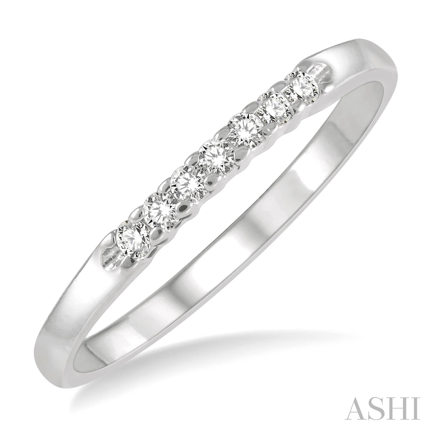 A lustrous 7 stones diamond wedding band, this can add sparkle to her eyes in an instance. As the name implies, the wedding band is embellished with 7 diamonds. There are 7 prong set round cut diamonds, lined in a neat row on the top half of the band. Together, they offer a shimmering touch to the wedding band. This beauty is sculpted in 14 karat white gold, size 6.75. Total diamond weight is 0.10 carat total weight.