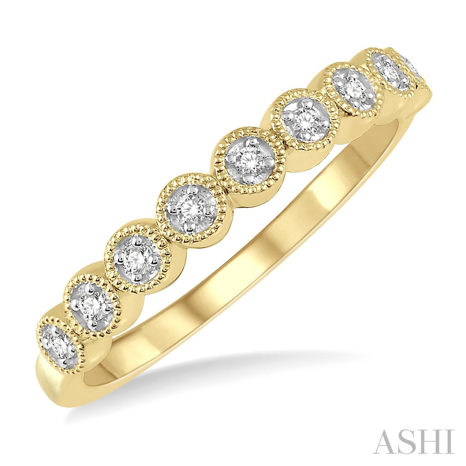 This charming stackable diamond band looks stunning with slim plain bands. Style it alongside a ring for volume and enhanced beauty. The ring features 9 circular mounts that are connected to form a row. Each of these mounts is studded with a pave set round cut diamond, making a total of 9 diamonds. Milgrain borders each of the circular mounts for a defining finish to the lovely ring. The diamond stackable band is framed in 14 karat yellow gold. The total diamond weight is 0.10 carats.