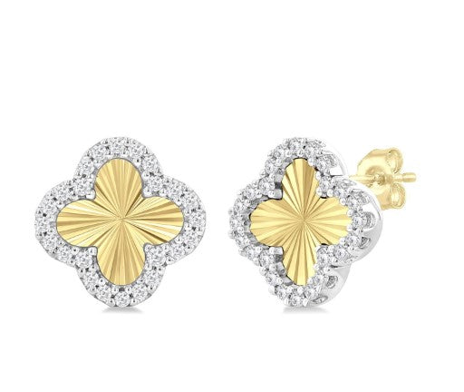 10K Two Toned Fluted Clover Stud Earrings, 0.20 Carat TW
