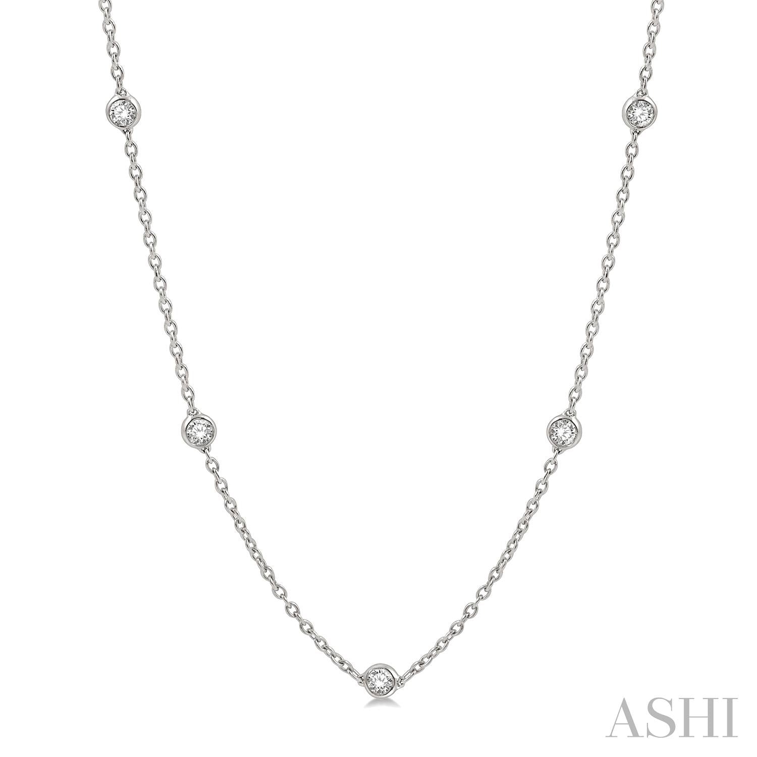 A delicate gold station necklace with diamond studs offering it an elegant touch. This pretty necklace can be worn by itself or with other accompaniments that you may choose to wear. It features 11 bezel set round cut diamonds that are placed at certain intervals around the link chain, to give it an even better and filling look. The cat link chain that makes up the necklace and has a standard length of 18 inches. The charming diamond necklace is designed in 14 karat white gold. The total diamond weight is 1.00 carat.