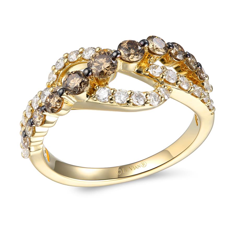 White and chocolate diamonds intertwine on this beautiful diamond fashion ring. The design of this ring is dainty yet eye-catching. With a diamond total weight of 1.24 carats, this 14 karat yellow gold ring is a beautiful piece that is simply irresistible.