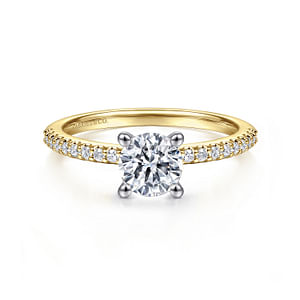 Discover timeless elegance with this stunning 14K white and yellow gold engagement ring, expertly crafted to capture light and admiration. Featuring a brilliant 1-carat cubic zirconia center stone surrounded by 0.15 carats of sparkling diamonds, this Gabriel & Co. masterpiece delivers luxury appeal at an exceptional value. The sophisticated two-tone design combines classic white gold with warm yellow gold accents, creating a sophisticated look that complements any style. Pre-sized at 6.5 with a 6.5mm head, this ring is ready to make your special moment unforgettable.