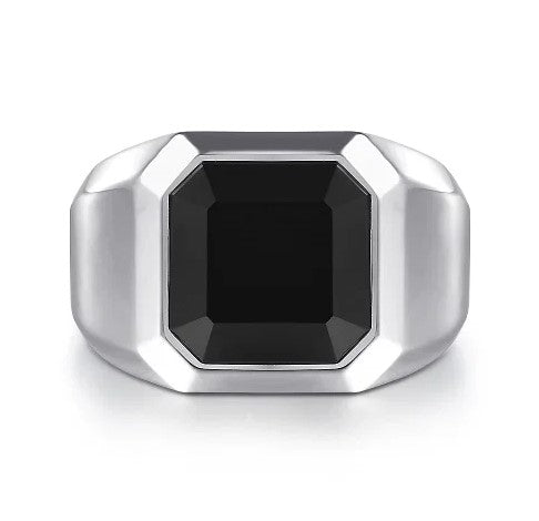 Indulge in luxury with our Sterling Silver Men's Black Onyx Ring. The classic faceted black onyx adds sophistication, while the satin finish enhances the sleekness of the sterling silver. This is a must-have ring for any man's collection. Elevate your style with this exclusive piece.