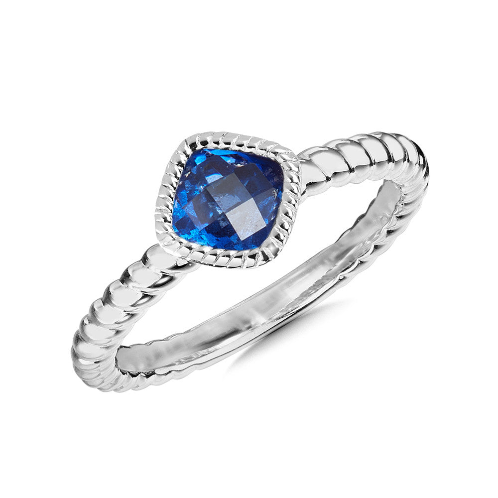In this bewitching sterling silver sapphire ring, there is a gorgeous cushion 5 millimeter sapphire center stone accented by rope texture detailing on the shoulders. The rope detailing gives this piece a beautiful yet classic design for an elegant, timeless look.