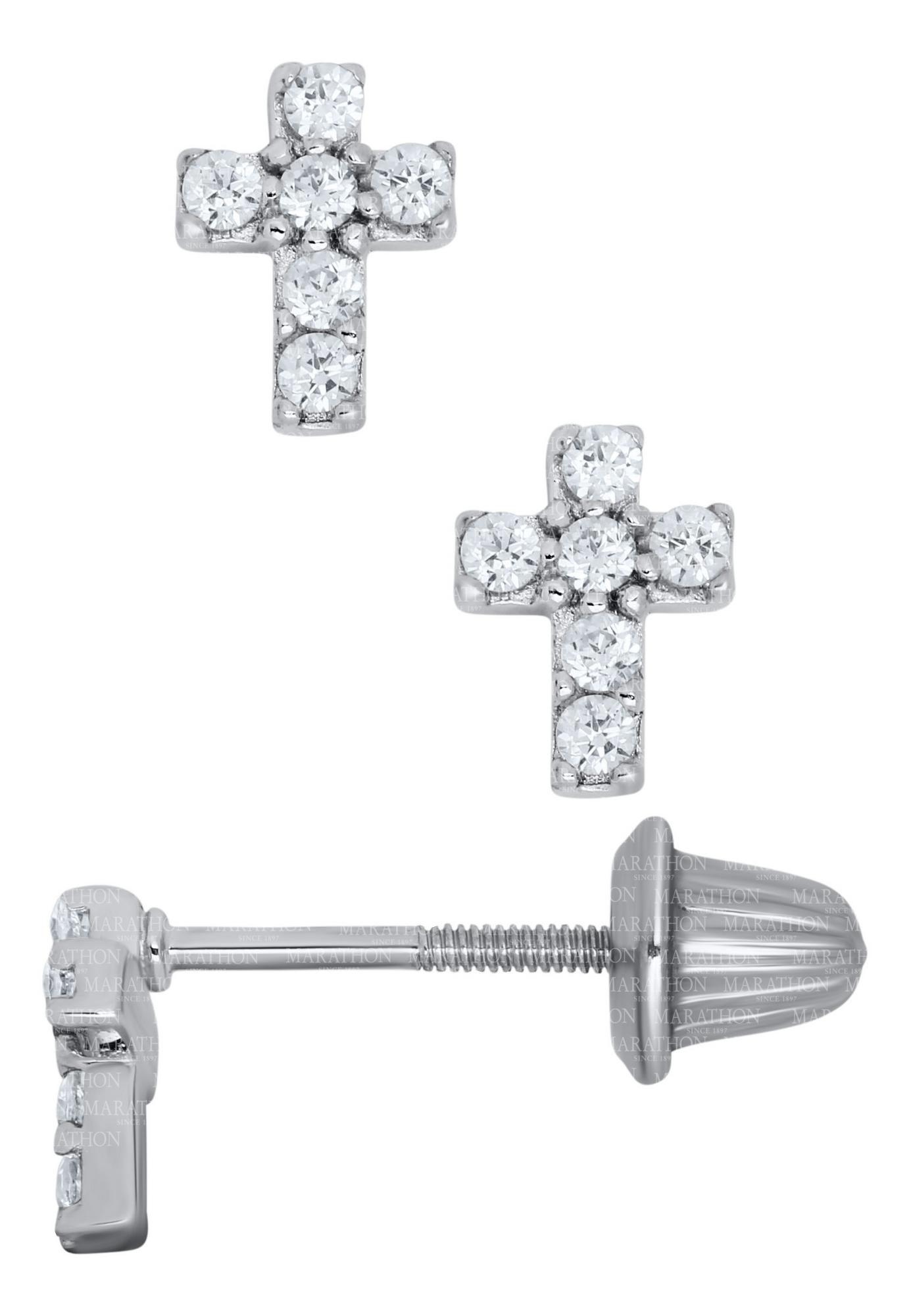 These beautiful earrings feature lovely crosses crafted from sterling silver, each having 6 handset white CZ. These pieced earrings feature threaded posts with bell backs for added safety.