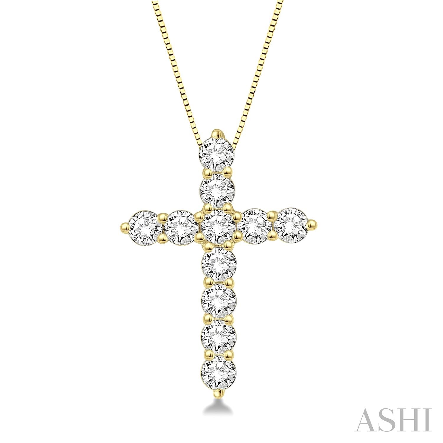 Express your love and faith in God with this charming diamond cross pendant. Gleaming 14 karat yellow gold pendant is adorned with 11 radiant prong set round cut diamonds arranged around the cross. It dangles from an elegant 18 inch box chain. Total diamond weight is 0.75 carat total weight.