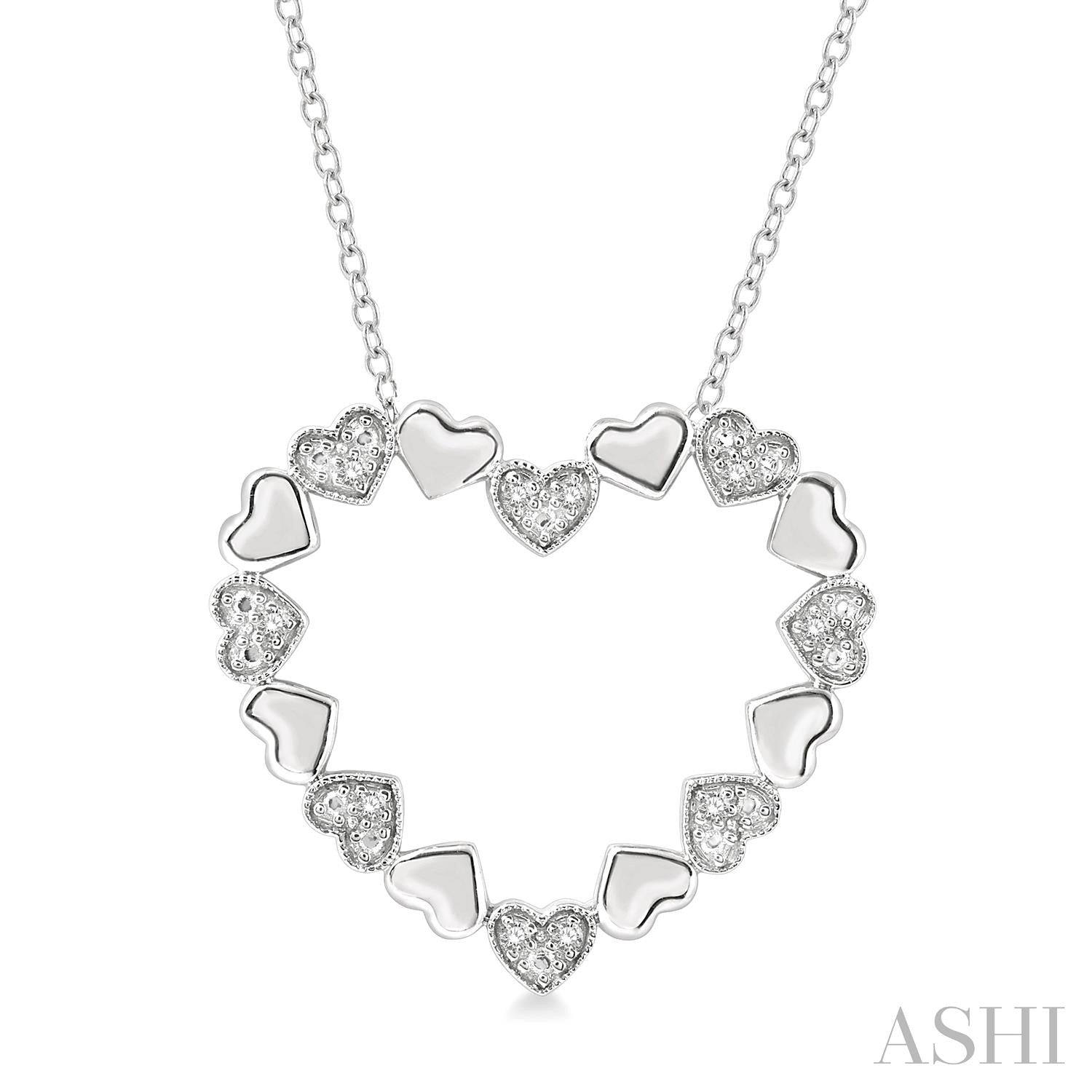 This Unique pendant design features a large heart shaped pendant made up of smaller heart shapes. The elegant diamonds in this piece make the entire heart shape gleam and glisten in the any light. The diamond total weight is 0.05 carats, and the chain length is 18 inches.