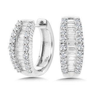 These stunning huggie style earrings are bedazzled with diamonds! Baguette diamonds set east to west in these earrings for a unique and stunning design. More diamonds line either side of the baguettes for a diamond total weight of 1.0 carats. To best accentuate the diamonds, these earrings are set in 14 karat white gold.
