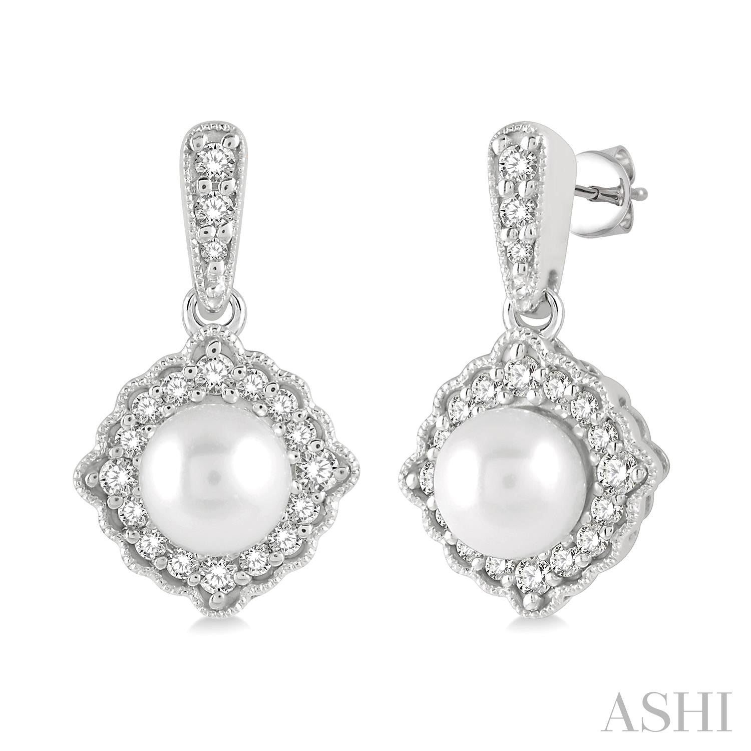 These lovely earrings feature round pearls haloed by lovely diamonds suspended from diamond encrusted pear shaped bars that have intricate carved edges for an overall romantic effect. Crafted from 10KW gold with a total diamond weight of .25 carats, these lovely earrings will ensure you are kept close to her heart.
