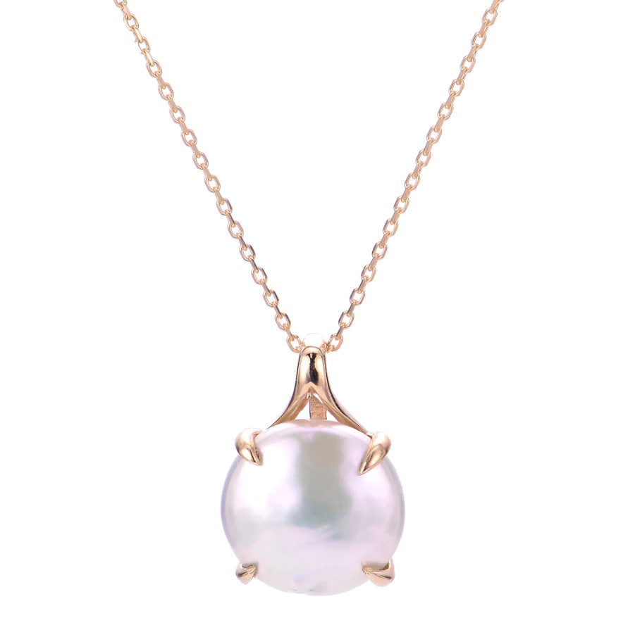 This classic coin pearl pendant belongs in every jewelry box! They are so precious and elegant. The pendant features a 12 to 13 millimeter, freshwater pearl, which simply means the pearl was created in a freshwater dwelling muscle. Additionally, the pendant is set in 14 karat yellow gold, and it hangs from an 18 inch chain.