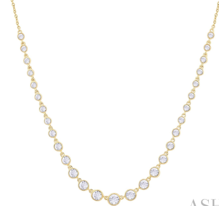 Indulge in luxury with our 14K Yellow Gold Graduated Diamond Station Necklace. The beautiful bezel set round cut diamonds gradually increase in size, totaling 1.25 carats. Love and elegance are combined in this stunning piece, making it a perfect addition to any jewelry collection. Sparkle and shine in style!