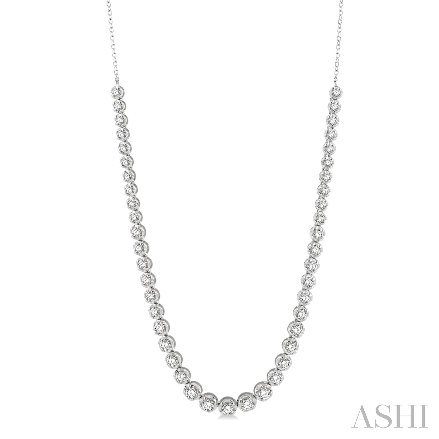 This 14 karat white gold necklace features an elegant diamond illusion design. It features 45 round diamonds closely placed side by side in a gradating fashion with an 18-inch cat chain completing the look. The total diamond weight is 3 carats.