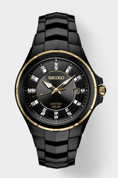 Enjoy the sporty look of this watch. This watch is stainless steel with black and gold coloring. The watch face is black with gold watch hands and numerals. Additionally, this watch is solar powered, so you will not have to change the watch battery!