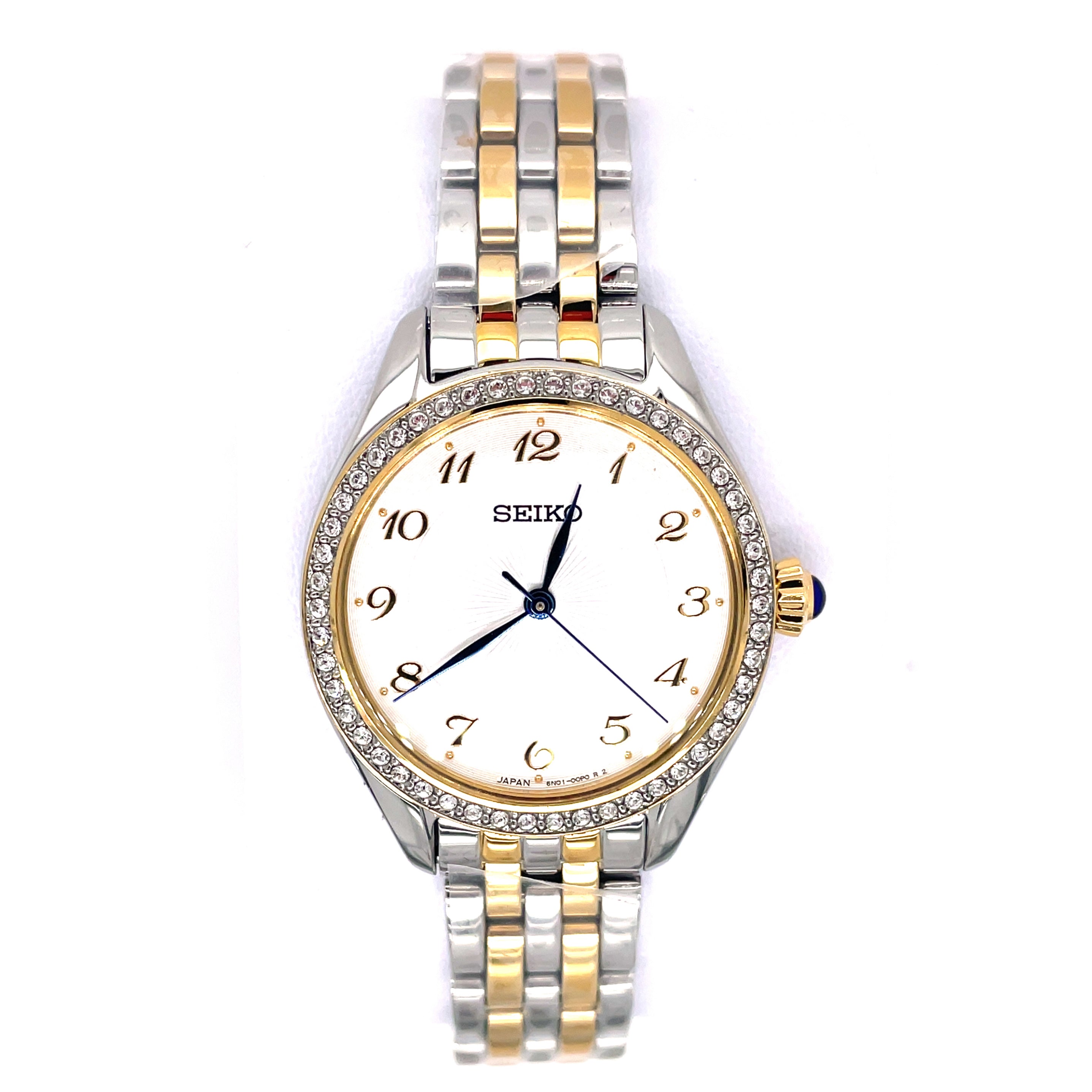 No matter your look this watch will bring it to the next level. This is a beautiful stainless steel ladies watch. The two-tone design gives the watch an air of sophistication that is simply irresistible. The white watch face contrast beautifully with the gold numbers and dark watch hands. Additionally, the crystals encircling the watch face add an elegance to the piece that sets it apart from the rest.