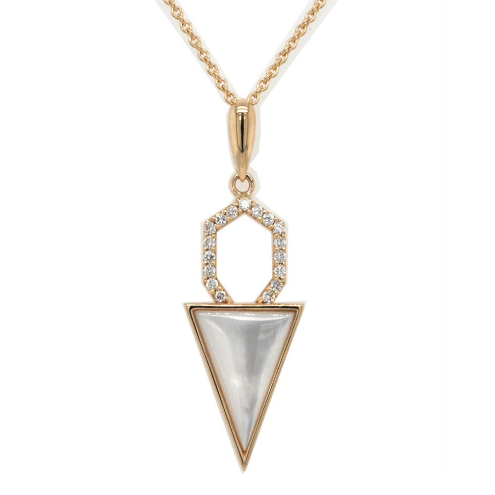 This beautiful pendant features a white, bezel set, triangular cut mother of pearl suspended below a diamond encrusted heptagon frame which hangs from a tear dropped shaped bail. Crafted form 14KY gold, the total diamond weight of this pendant is 0.10 carats. The classic look of this pendant is sure to be the finishing touch to any outfit!